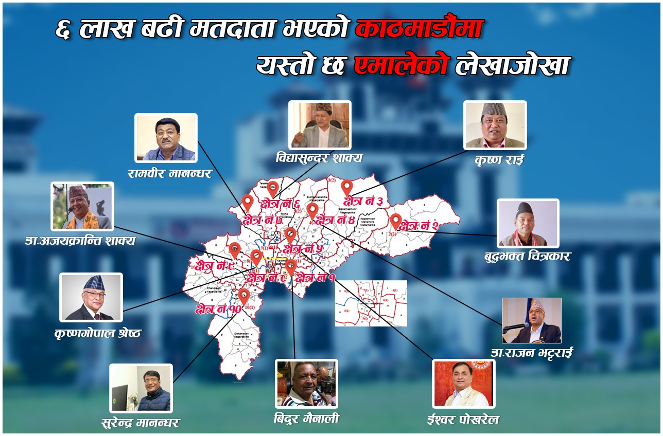 मैत्री न्युजले मुलुकभरीकै उम्मेदवारका आकांक्षी, उनीहरुले टिकट पाउने सम्भावना र जित सुनिश्चितताका केही पाटोलाई केलाएर विश्लेषण गर्ने जमर्को गरेको छ । ७७ जिल्ला मध्ये सबैभन्दा बढी निर्वाचन क्षेत्र रहेको काठमाडौँ संघीय राजधानी पनि हो । यो जिल्लामा १० वटा निर्वाचन क्षेत्र रहेका छ । अहिलेसम्मको अवस्थालाई हेर्दा मुलुकभरी नै काँग्रेस, माओवादीलगायतको गठबन्धनसँग नेकपा (एमाले) एक्लै प्रतिस्पर्धा गर्दैछ । अघिल्लो संघ र प्रदेशको निर्वाचनलाई हेर्ने हो भने काठमाडौँमा जितको संख्यालाई आधार मान्दा एमाले पहिलो शक्तिको रुपमा देखिएको छ । १० मध्ये संघमा ६ क्षेत्रमा एमाले एक्लैले जितेको थियो । यद्यपि, त्यतिबेला जितेका दुई सांसद माधवकुमार नेपाल र जीवनराम श्रेष्ठ अहिले एमालेमा हुनुहुन्न । उहाँहरु नेकपा एकीकृत समाजवादीसँग आवद्ध हुनुहुन्छ । उहाँहरु आवद्ध दल अहिले गठबन्धन बनाएरै निर्वाचनमा जाने पक्षमा छ । काँठमाडौँमा निकै कमजोर शक्तिका रुपमा रहेको माओवादी पनि गठबन्धनसँगै रहने निश्चित जस्तै छ । यद्यपि, काठमाडौंमा तेस्रो शक्तिका रुपमा रहेको राष्ट्रिय प्रजातन्त्र पार्टी भने गठबन्धनमा सहभागी हुने संभावना अहिलेसम्म देखिएको छैन । उक्त शक्ति एमालेसँग मिल्ने संभावनालाई पनि अहिले नै नकारी हाल्ने अवस्था भने छैन ।