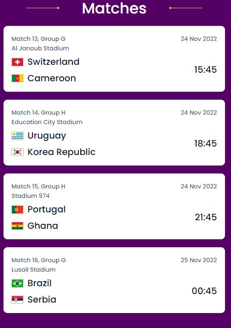 त्यस्तै पाेर्चुगल विरुद्ध घानाकाे खेल राती ९:४५ बजे हुँदैछ भने ब्राजिल विरुद्ध सर्बियाकाे खेल रातकाे १२:४५ बजे हुनेछ ।
