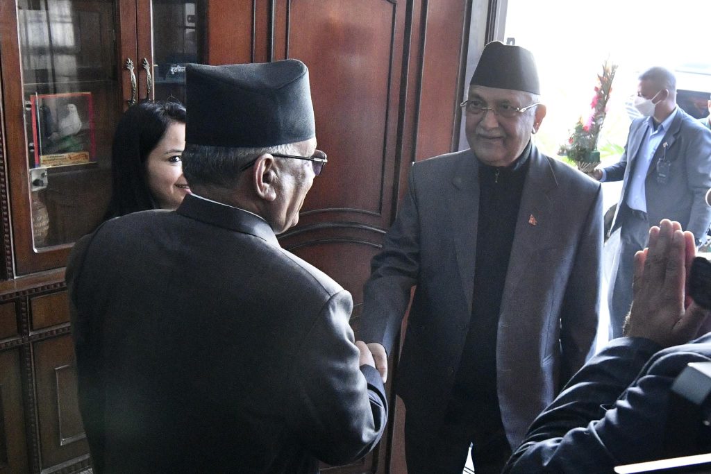 प्रचण्डलाई भेट्न अध्यक्ष ओली एक्लै प्रचण्ड निवास पुग्नु भएको प्रचण्डका स्वकीय सचिव रमेश मल्लले जानकारी दिनुभयो । अहिले उहाँहरूबिच बार्ता भइरहेको छ । भेटवार्तामा सरकार सञ्चालन, विस्तारलगायत समसामयिक विषयमा छलफल भएको जनाइएको छ ।