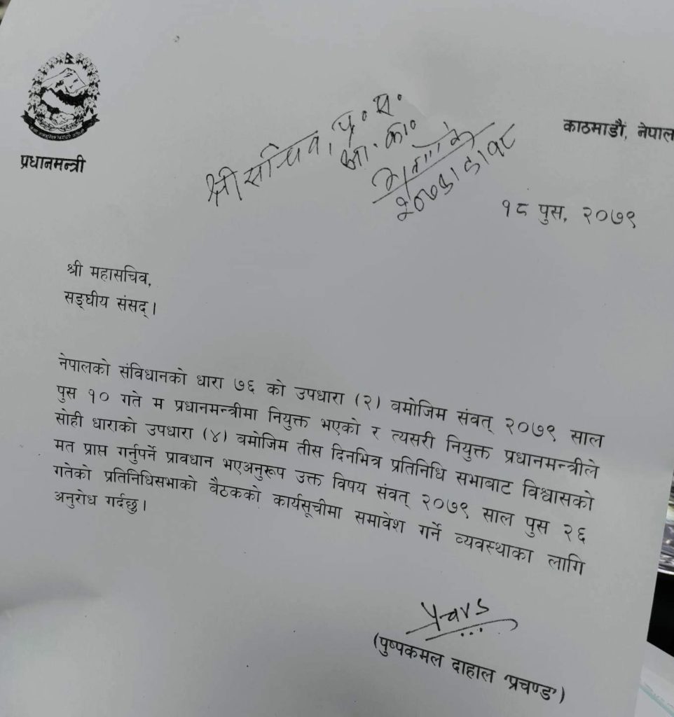 प्रधानमन्त्री प्रचण्डले २६ गते विश्वासको मत लिने विषय संसदको कार्यसूचीमा राख्न पत्र पठाएका हुन् ।