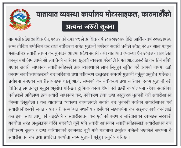 बागमती प्रदेश आर्थिक ऐन २०७९ को दफा १८ ले आर्थिक वर्ष २०७०/०७१ देखि आर्थिक वर्ष २०७५/०७६ सम्म तोकिएबमोजिम कर तथा नवीकरणसमेत भुक्तानी नगरेका सवारी धनीले फागुन मसान्तभित्र कर बुझाउन आएमा प्रदेश सवारी तथा यातायात व्यवस्था ऐन २०७५ अनुसार लाग्ने सो अवधिको जरिवाना छुटको व्यवस्था गरेको सूचनामा उल्लेख छ।