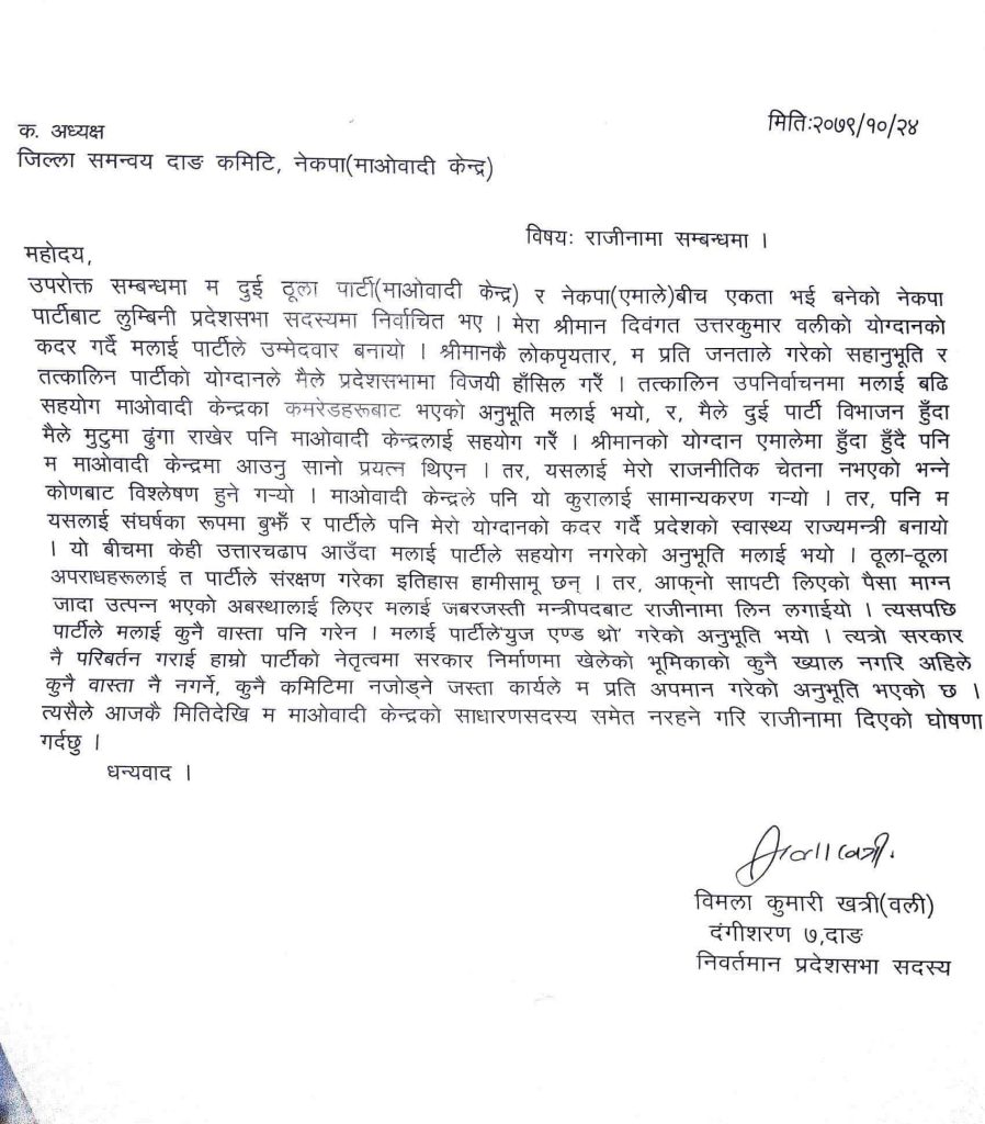 दाङ, १ फागुन । लुम्बिनी प्रदेशकी पूर्वस्वास्थ्य राज्यमन्त्री विमला वलीले नेकपा माओवादी केन्द्रबाट राजीनामा दिएकी छन् ।