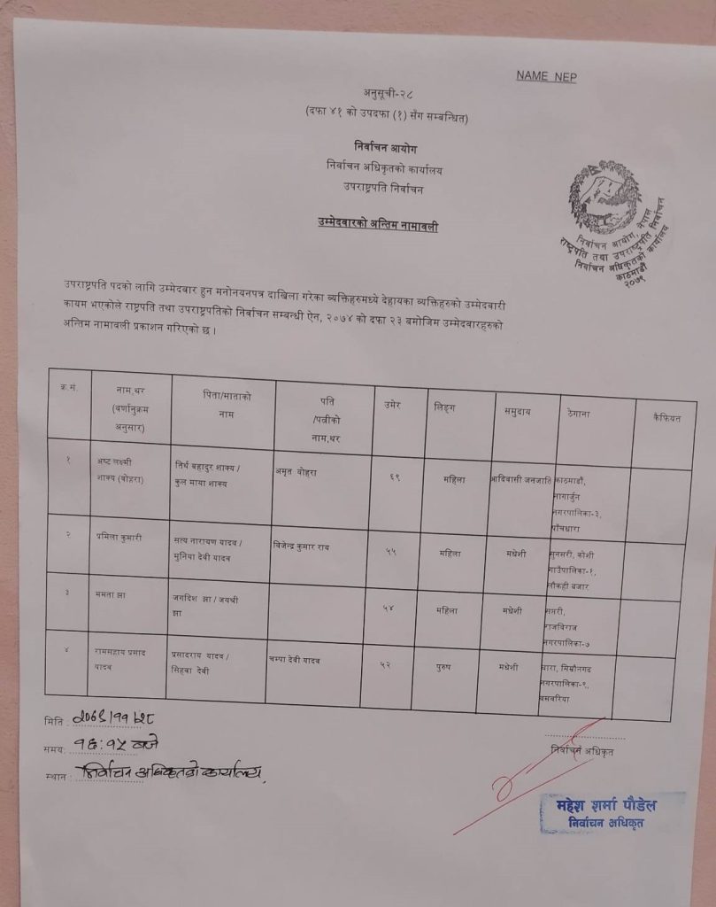 चैत ३ गते हुने उपराष्ट्रपतिको निर्वाचनका लागि चारै जना उम्मेदवारको नामावली कायम भएपछि निर्वाचन अधिकृतको कार्यालयले चार जनाको नामावली सार्वजनिक गरेको हो।
