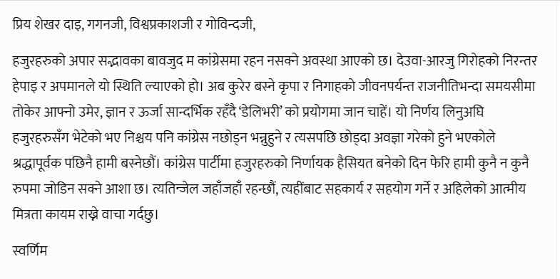 ‘हजुरहरुको अपार सद्भावका बावजुद म कांग्रेसमा रहन नसक्ने अवस्था आएको छ’ उनले आफ्नो सन्देशमा भनेका छन्, ‘देउवा–आरजु गिरोहको निरन्तर हेपाइ र अपमानले यो स्थिति ल्याएको हो ।’