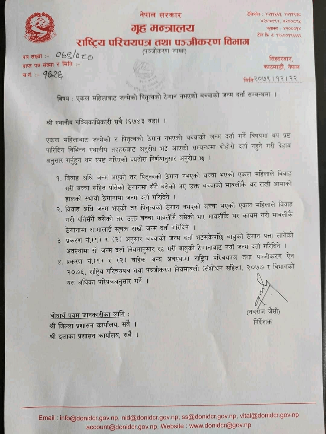 विभागले ६ हजार ७४३ वटै वडा कार्यालयका स्थानीय पञ्जिकाधिकारीलाई ४ बुँदे सर्कुलर पठाएर सो निर्देशन दिएको हो ।