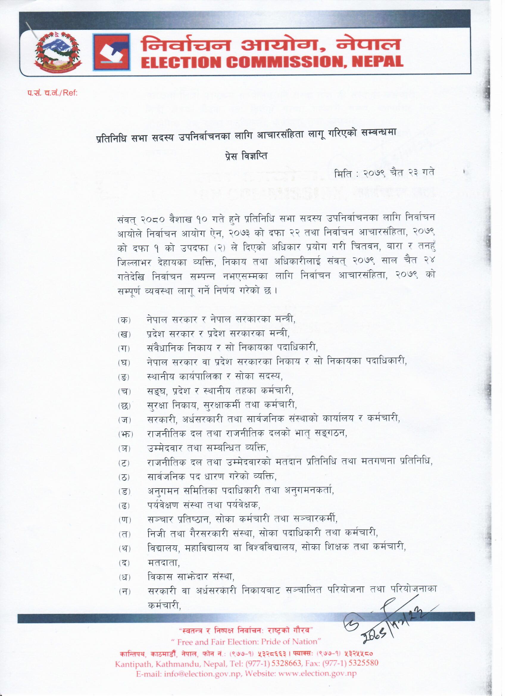 निर्वाचन आयोगका अनुसार उपनिर्वाचन हुने चितवन, बारा र तनहुँमा मन्त्रीहरु, संवैधानिक निकायका पदाधिकारी, स्थानीय कार्यपालिकाका सदस्यलगायतका लागि निर्वाचन आचारसंहिता लागू गर्ने निर्णय गरेको हो ।