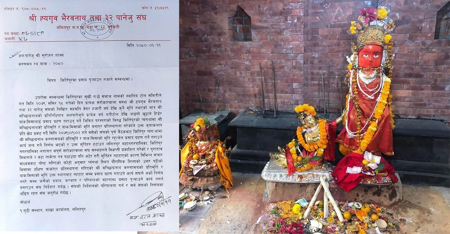 मत्स्येन्द्रनाथका पुजारीहरूको संगठन ‘श्री ह्यगृव भैरवनाथ तथा ३२ पानेजु संघ’ ले हिजो कीर्तिपुरमा उक्त प्रसाद चढाउने जिम्मेवारी पाएका जलपानेजु सुरोजन शाक्ययात पत्र पठाई यो वर्ष कीर्तिपुरमा प्रसाद चढाउन नजानका लागि निर्देशन दिएको हो ।