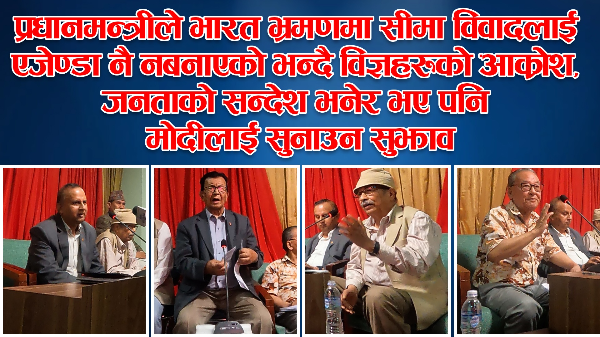 उहाँले विगतमा भएका असामन सन्धी सम्झौतालाई नयाँ शिराराबाट नविकरण गर्ने कुरालाई पनि जोड दिनुपर्ने बताउनुभयो । सीमाविद् बुद्धिनारायण श्रेष्ठले प्रधानमन्त्रीले भारत भ्रमणका सन्र्दभमा सीमा विवादको समाधानलाई प्रमुख मुद्धा बनाउनु पर्नेमा जोड दिनुभयो । उहाँले लिपु लेक, लिम्पियाधुरा नेपालकै भू–भाग भएको भन्दै चुच्चे नक्शा नेपालले निकालिसकेको अवस्थामा त्यो विषयलाई उठाउनु पर्नेमा जोड दिनुभयो ।