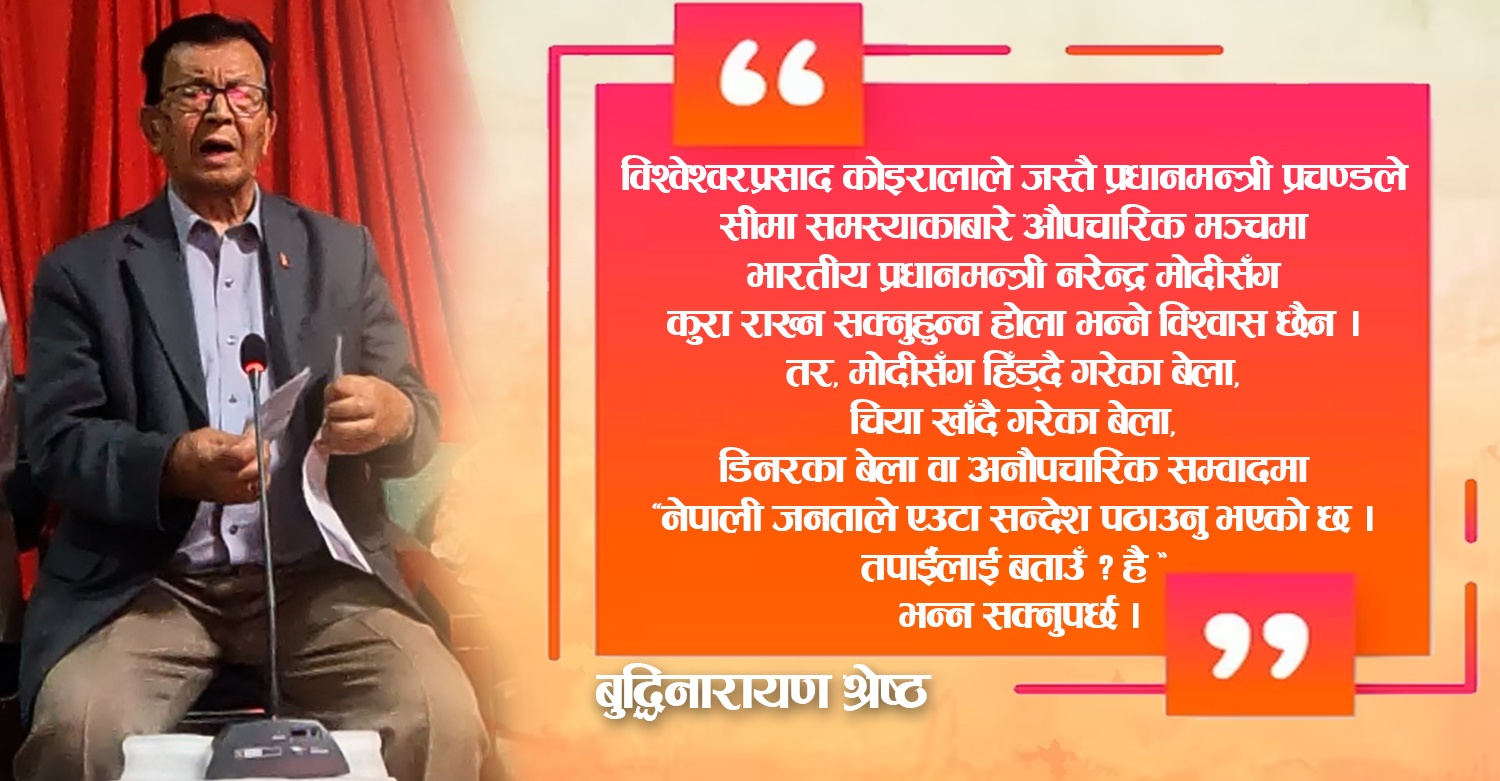 विश्वेश्वरप्रसाद कोइरालाले जस्तै प्रधानमन्त्री प्रचण्डले सीमा समस्याकाबारे औपचारिक मञ्चमा भारतीय प्रधानमन्त्री नरेन्द्र मोदीसँग कुरा राख्न सक्नुहुन्न होला भन्ने विश्वास छैन । तर, मोदीसँग हिँड्दै गरेका बेला, चिया खाँदै गरेका बेला, डिनरका बेला वा अनौपचारिक सम्वादमा ‘नेपाली जनताले एउटा सन्देश पठाउनु भएको छ । तपाईँलाई बताउँ ? है भन्न सक्नुपर्छ ।