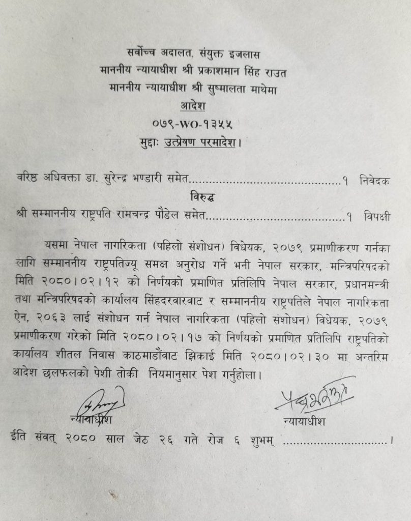संविधान विपरीत राष्ट्रपति पौडेलले नागरिकता विधेयक प्रमाणीकरण गरेको भन्दै वरिष्ठ अधिवक्ता सुरेन्द्र भण्डारीले सर्वोच्चमा रिट दायर गरेका थिए ।