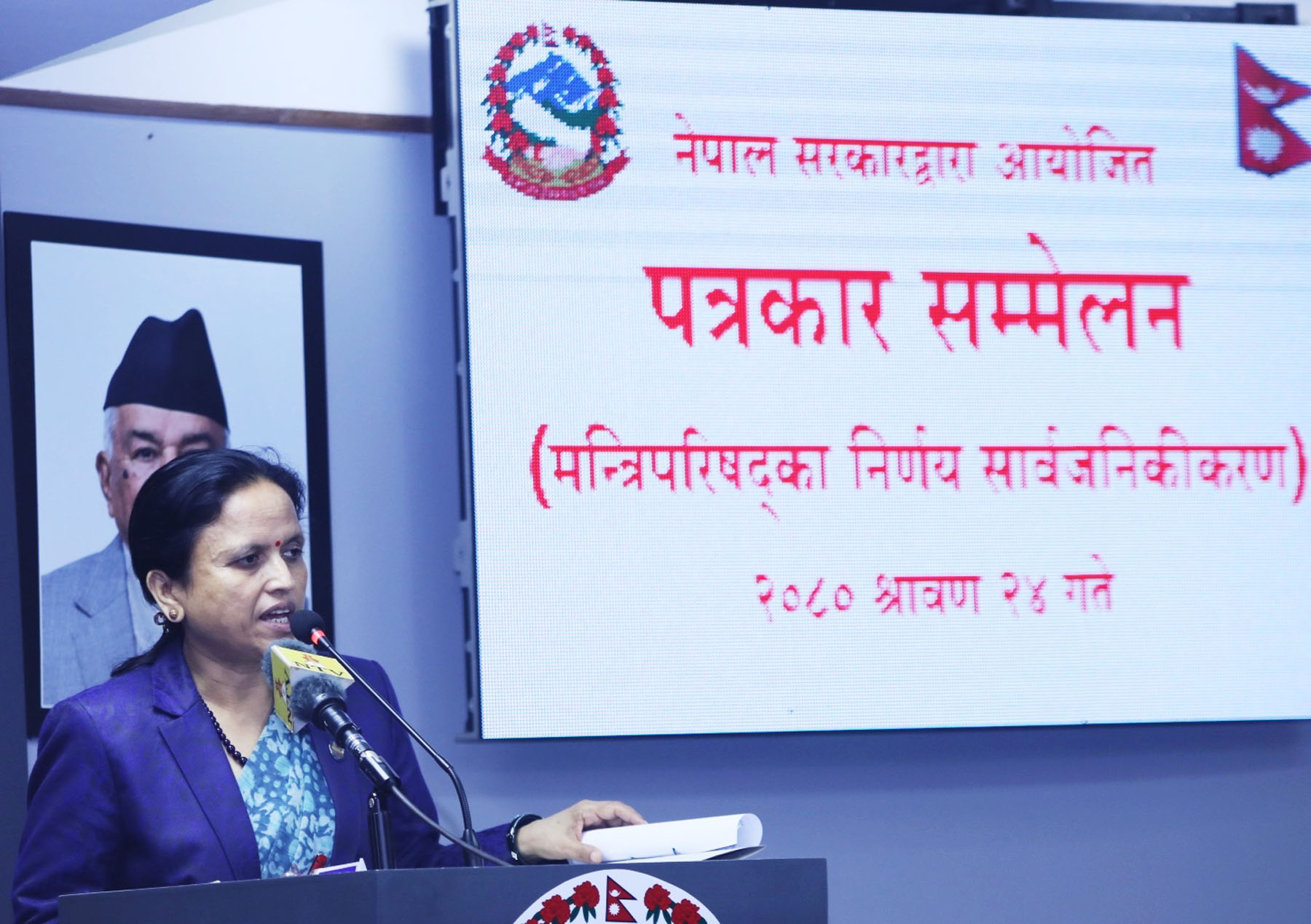 मन्त्रिपरिषद्को बैठकले गरेकाे निर्णय सार्वजनिक गर्न आज सञ्चार मन्त्रालयमा आयोजित पत्रकार सम्मेलनमा सरकारका प्रवक्ता एवं सञ्चार तथा सूचना प्रविधिमन्त्री रेखा शर्माले उक्त जानकारी दिनुभएको हो । बैठकले मन्त्रिपरिषद् आर्थिक तथा पूर्वाधार समितिबाट पेस भएको सिंहदरबारको संशोधित गुरुयोजना स्वीकृत गर्ने निर्णय गरेको छ ।