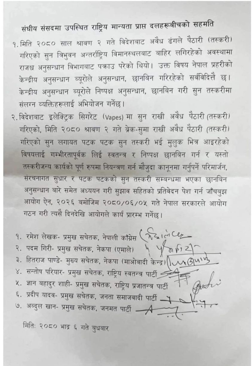 सहमतिको दोस्रो बुँदामा सो पछि समिति बनाउने उल्लेख छ । ‘विदेशबाट इलेक्ट्रिकस सिगरेट (भेप) मा सुन राखी अवैध पैठारी (तस्करी गरिएको मिति २०८० साउन २ गते ब्रेक–सुमा राखी अवैध पैठारी (तस्करी) गरिएको सुनलगायत पटक–पटक सुन तस्करी भइ मुलुक भित्र आइरहेको विषयलार्ए गम्भीरतापूर्वक लिइ स्वतन्त्र र निष्पक्ष छानबिन गर्न र यस्तो तस्करीजन्य कार्यको पूर्णरुपमा नियन्त्रण गर्न मौजुदा काूनमा गर्नुपर्ने परिमार्जन, संरचनागत सुधार र पटकपटकको सुन तस्करी सम्बन्धमा भएका छानबिन अनुसन्धानबारे समेत अध्ययन गरी सुझाव सहितको प्रतिवेदशन पेश गर्न जाँचबुझ आयोग ऐन, २०२६ बमोजिम २०८० /०६/०५ गते नेपाल सरकारले आयोग गठन गरी त्यसै दिनदेखि आयोगले कार्य प्रारम्भ गर्नेछ,’ दुई नम्बर बुँदामा भनिएको छ ।