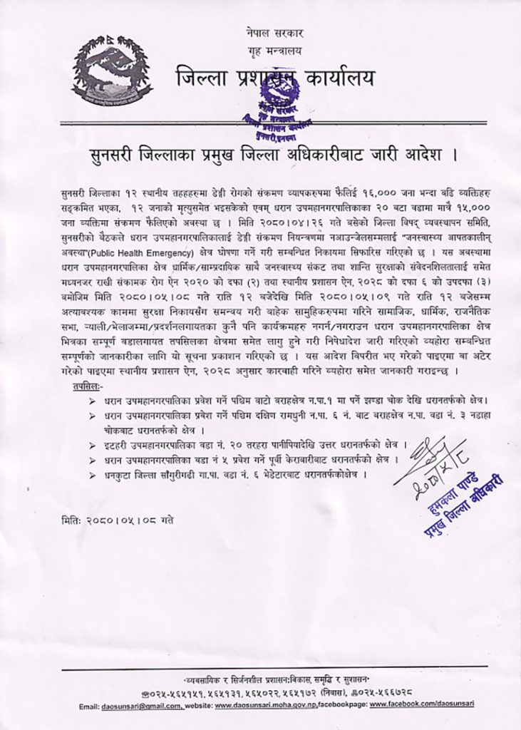 ‘धरान उपमहानगरपालिका क्षेत्र धार्मिक र साम्प्रदायिक साथै जनस्वास्थ्य संकट तथा शान्ति सुरक्षाको संवेदनशिलतालाई समेत मध्यनजर राखी संक्रामक रोग ऐन २०२० को दफा (२) तथा स्थानीय प्रशासन ऐन, २०२८ को दफा ६ को उपदफा (३) बमोजिम मिति २०८०।०५।०८ गते राति १२ बजेदेखि मिति २०८०।०५।०९ गते राति १२ बजेसम्म अत्यावश्यक काममा सुरक्षा निकायसँग समन्वय गरी बाहेक सामूहिक रुपमा गरिने सामाजिक, धार्मिक, राजनैतिक सभ, भेला, जम्मा र प्रदर्शनलगायतका कुनै पनि कार्यक्रमहरु नगर्न–नगराउन धरान उपमहानगरपालिका क्षेत्र भित्रका सम्पूर्ण वडालगायत तपसिलका क्षेत्रमा समेत लागू हुने गरी निषेधादेश जारी गरिएको व्यहोरा सम्बन्धित सम्पूर्णको जानकारीका लागि यो सूचना प्रकाशन गरिएको छ’, उक्त सूचनामा उल्लेख छ ।