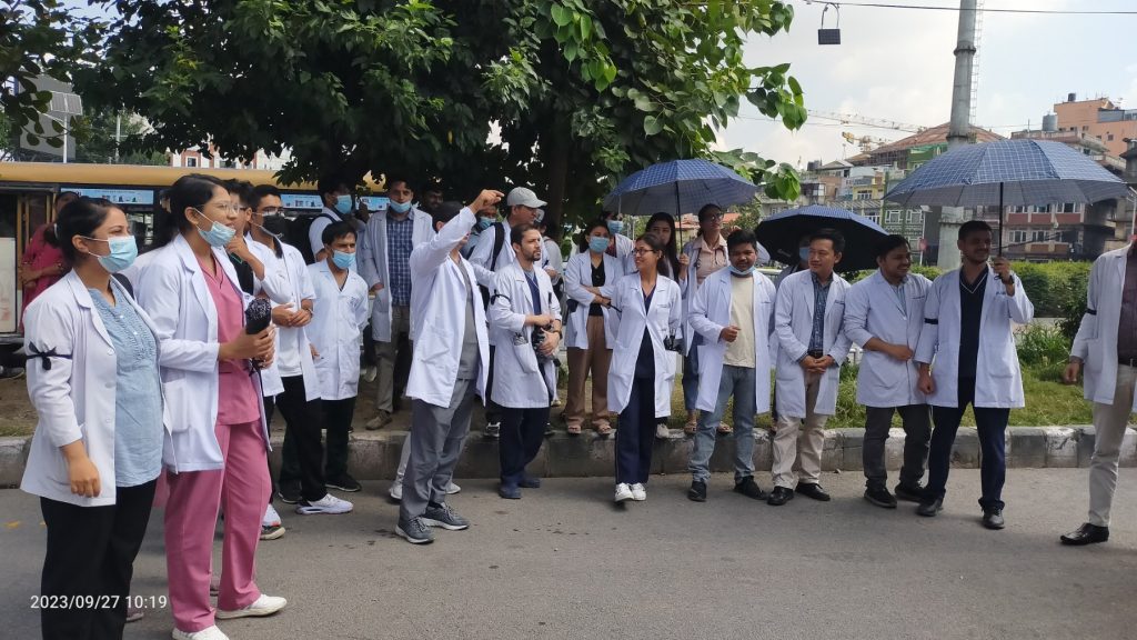 चिकित्सकहरूकाे आन्दोलन आज पनि जारी, गृहमन्त्री र स्वास्थ्य मन्त्रीकाे राजीनामा माग्दै नाराबाजी(तस्बिरहरू)