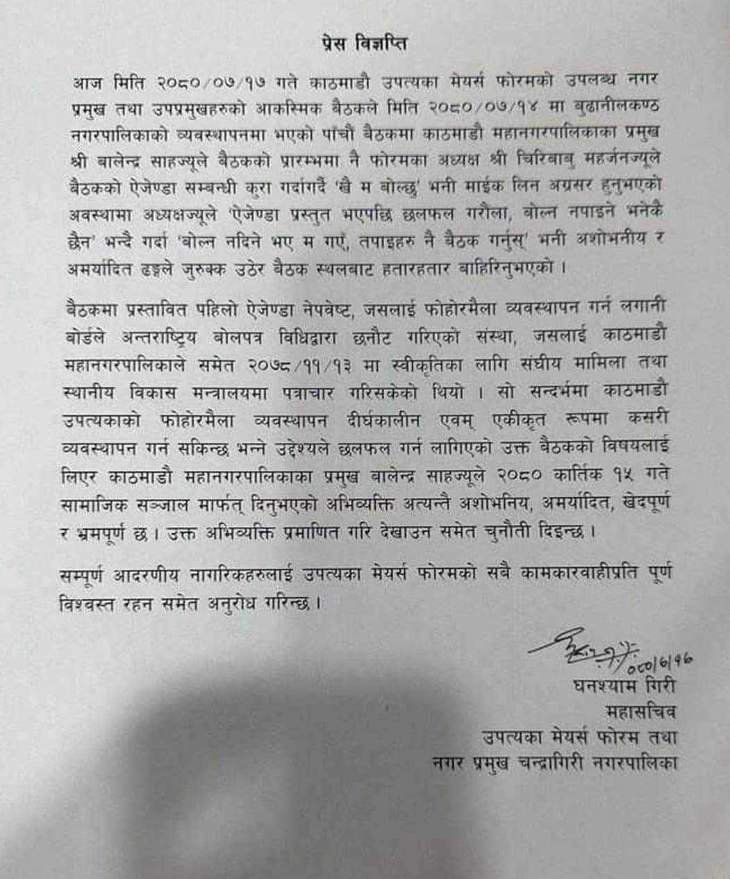 विज्ञप्तिमा भनिएकाे छ, काठमाडौ उपत्यकाको फोहोरमैला व्यवस्थापन दीर्घकालीन एवम् एकीकृत रूपमा कसरी व्यवस्थापन गर्न सकिन्छ भन्ने उद्देश्यले छलफल गर्न लागिएको उक्त बैठकको विषयलाई लिएर काठमाडौ महानगरपालिकाका प्रमुख बालेन्द्र साहज्यूले २०८० कार्तिक १५ गते सामाजिक सञ्जाल मार्फत् दिनुभएको अभिव्यक्ति अत्यन्तै अशोभनिय अमर्यादित, खेदपूर्ण र भ्रमपूर्ण छ । उक्त अभिव्यक्ति प्रमाणित गरि देखाउन समेत चुनौती दिइन्छ ।