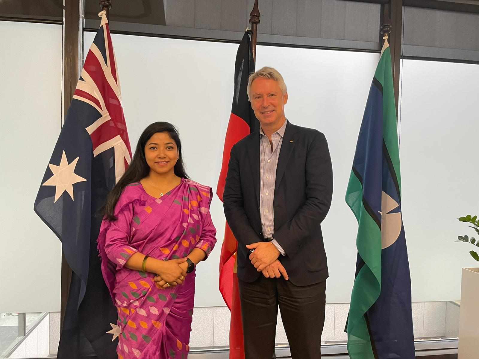 भ्रमणका सिलसिलामा न्यू साउथ व्हेल्सको निर्देशक र पुर्व अष्ट्रेलियन राजदुत क्रिसपिन कोनरोय र संयुक्त राष्ट्रसंघ महिलाकी प्रतिनिधि जेन रोनफेल्डसँग पनि भेटवार्ता भएको थियो । भेटमा दुई देश बीचको दुईपक्षीय सम्बन्धलाई थप सुदृढ बनाउने र अनुभव आदानप्रदान गर्ने विषयमा केन्द्रित भएको थियो ।