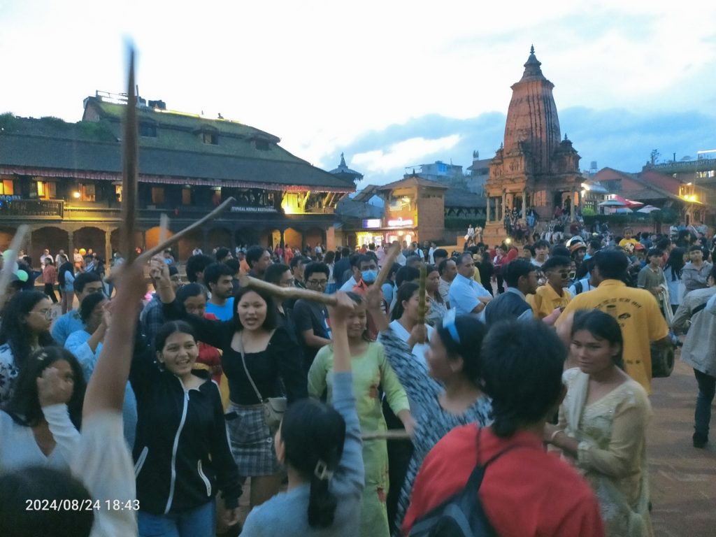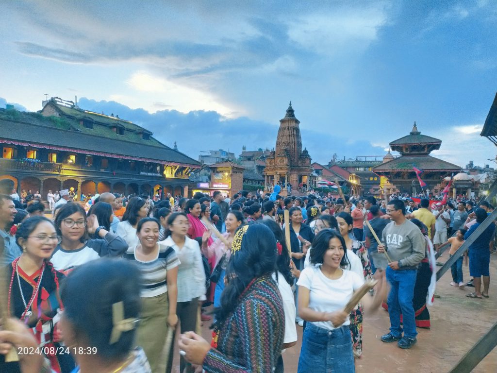 भक्तपुर, ८ भदौ । भक्तपुरमा आठ रात नौ दिनसम्म मनाइने गाईजात्रा पर्व आज पाँचाैं दिनपनि घिन्ताङघिसी ट्वाक गर्दै मनाएका छन् ।