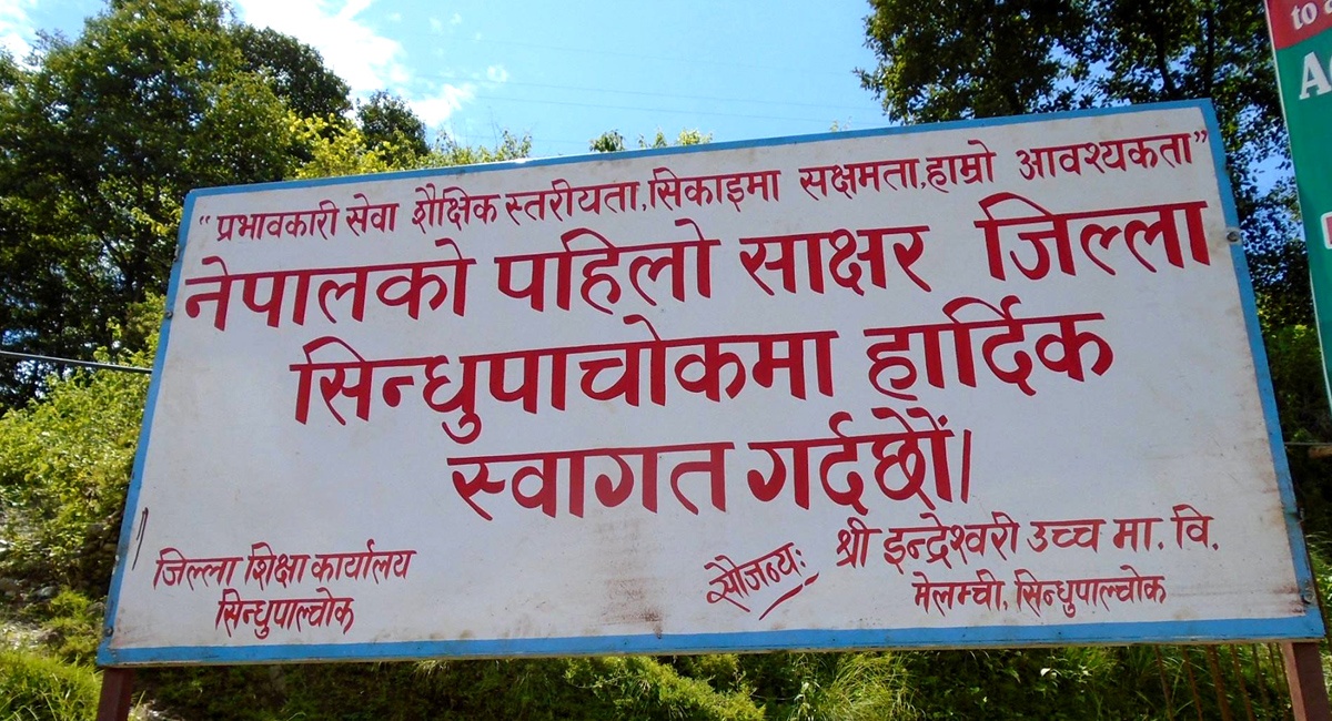 ‘त्यो बेला अनौपचारिक शिक्षा केन्द्रको नियमअनुसार हामीले सिन्धुपाल्चोकलाई पहिलो साक्षर जिल्ला घोषणा गरेका थियौं’, तत्कालीन जिल्ला शिक्षा अधिकारी गेहनाथ गौतम भन्छन्– ‘साक्षर जिल्ला बनाउन जिल्लाभर सञ्चालन गरिएको साक्षरता कक्षामा सहभागीले मोबाइल, क्यालकुलेटर चलाउन सक्ने, १ देखि ९ सम्मका अंक लेख्न तथा १ देखि सयसम्म गणना गर्न, सामान्य लेखपढ गर्न सक्ने नसक्ने जाँच गरी मूल्यांकन गरी अनौपचारिक शिक्षा केन्द्रमा पेश गरेका थियौं। हाम्रो साक्षर जिल्लाको अनुगमन गरेर केन्द्रले २०७१ असार २ गते सिन्धुपाल्चोकलाई देशकै पहिलो साक्षर जिल्ला घोषणा गरेको थियो।’