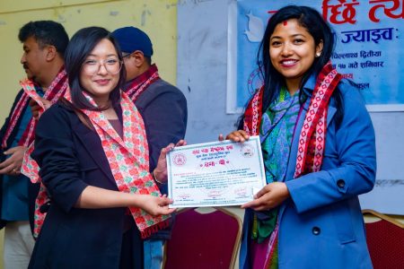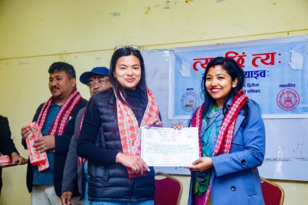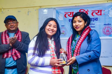 त्य: छिं त्य:काे समापन कार्यक्रममा प्रमुख अतिथि काठमाडाैं महानगरपालिकाका उपप्रमुख सुनिता डंगाेलले सहभागीहरूलाइ मायाँकाे चिनाे वितरण गर्नुभएकाे थियाे ।