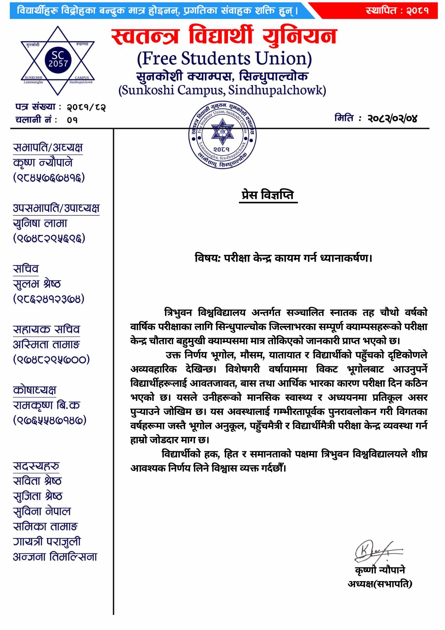 सुनकोशी क्याम्पस लामोसाँघुका स्ववियु सभापित कृष्ण न्यौपानेले आइतबार एक विज्ञप्ती जारी गर्दै परीक्षा केन्द्रहरु यथावत कायम गर्न विश्वविद्यालयलाई ध्यानाकर्षण गराएका छन् । विश्वविद्यालयले जिल्लाभरका क्याम्पसका परीक्षा केन्द्र चौतारा बहुमुखी क्याम्पसमा मात्र तोकिदिएको छ ।