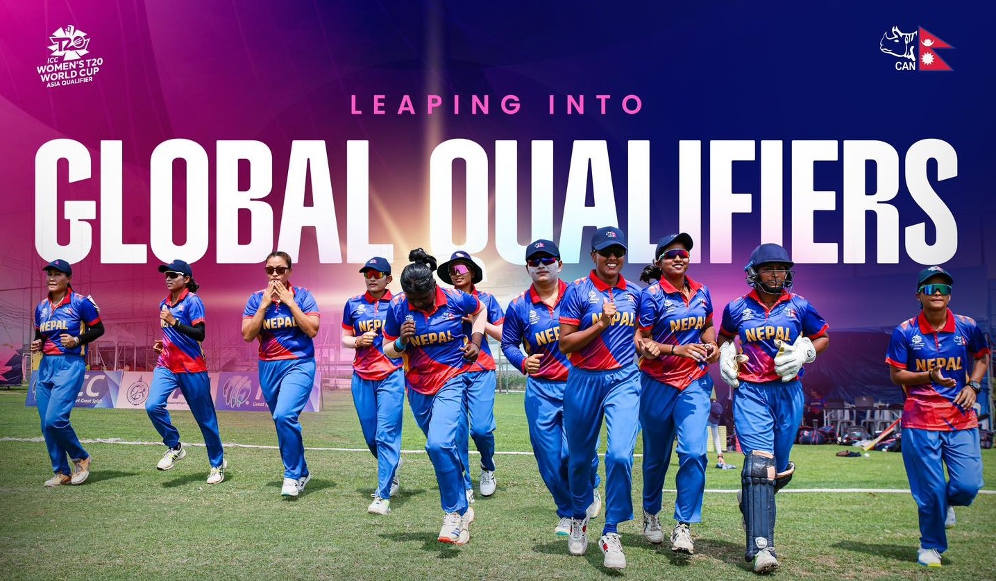 काठमाडौँ, ५ जेठ । नेपाली महिला क्रिकेट टिमले सोमबार आईसीसी महिला टी–२० विश्वकपको ग्लोबल क्वालिफायरमा पुगेर इतिहास बनाएको छ । नेपालले सुपर थ्रीमा युएइलाई पाँच विकेटले हराएर आइसिसी महिला टि२० विश्वकप एसिया छनोट पार गर्यो । नेपाल पहिलो पटक महिला टि२० विश्वकपको ग्लोबल क्वालिफायरमा पुगेको हो ।