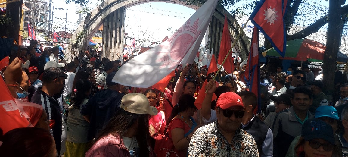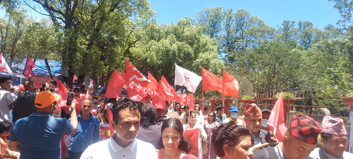 उत्सव मनाउन काठमाडौँ उपत्यकाका विभिन्न स्थानबाट एमालेका नेता, कार्यकर्ता र्यालीसहित प्रदर्शनीमार्गस्थित भृकुटीमण्डपमा भेला भइरहेका छन् ।