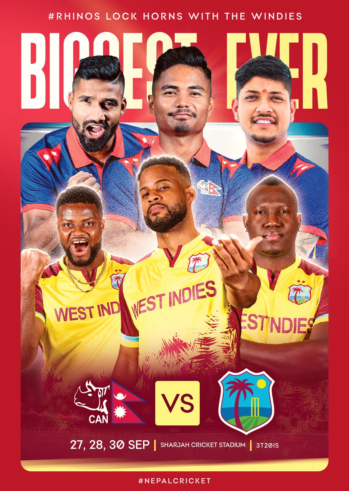 नेपाल क्रिकेट संघ (क्यान)ले बिहिबार विज्ञप्ति जारी गरी नेपाल र वेस्ट इन्डिजबीच बहुप्रतिक्षित क्रिकेट शृङ्खला हुने जनाएको हो । सो शृङ्खला तथस्ट मैदान संयुक्त अरब इमिरेट्को शारजाह क्रिकेट रङगशालामा हुनेछ । पहिलो खेल सेप्टेम्बर २७, दोस्रो खेल सेप्टेम्बर २८ र तेस्रो तथा अन्तिम खेल सेप्टेम्बर ३० तारिखमा हुनेछ ।