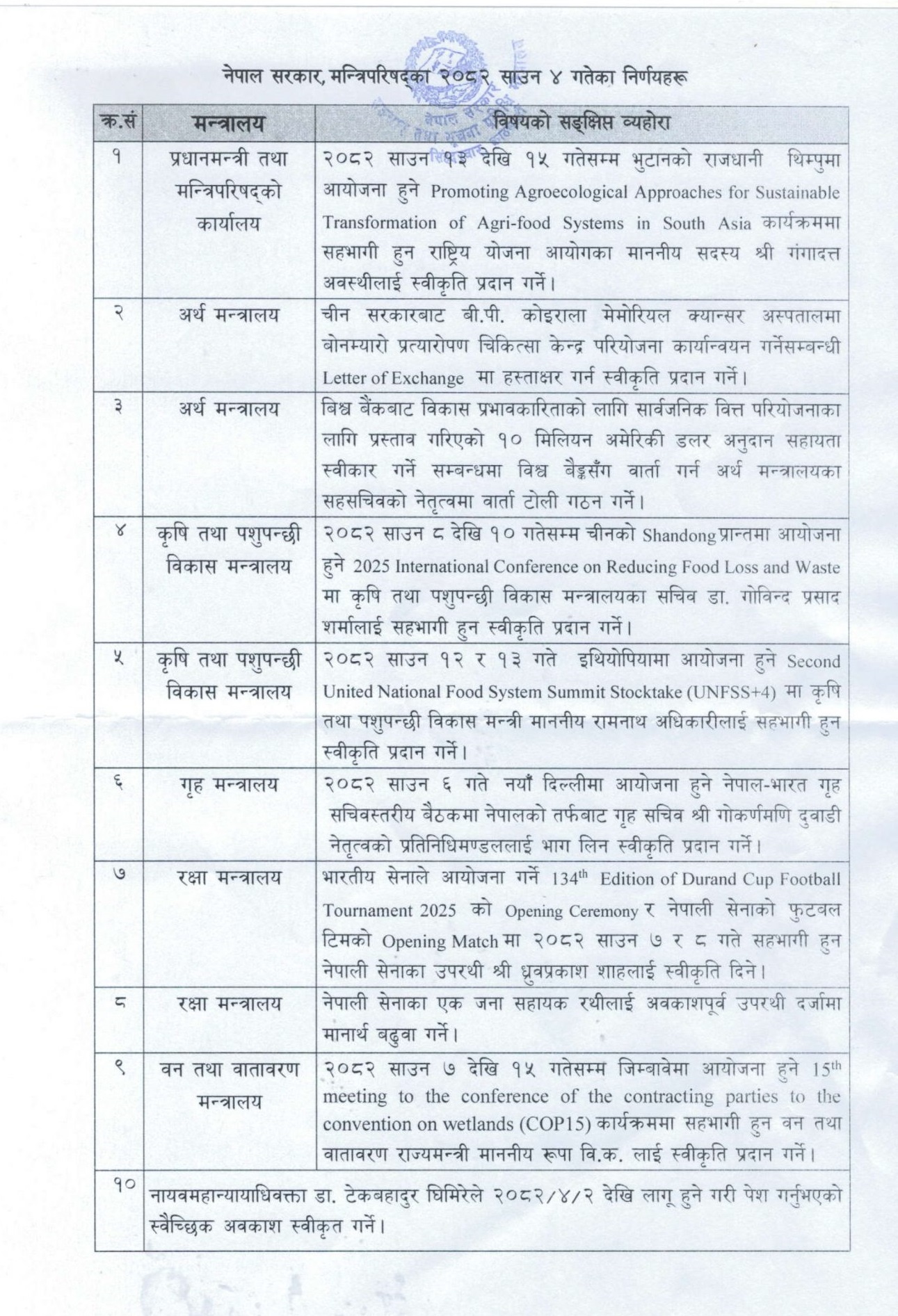 काठमाडौँ, ७ साउन । सरकारले साउन ४ गते आइतबार बसेको मन्त्रिपरिषद् बैठकका निर्णयहरू सार्वजनिक गरेको छ।