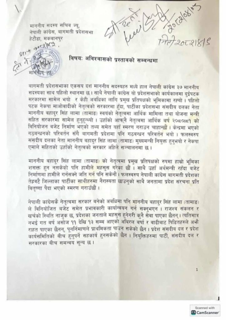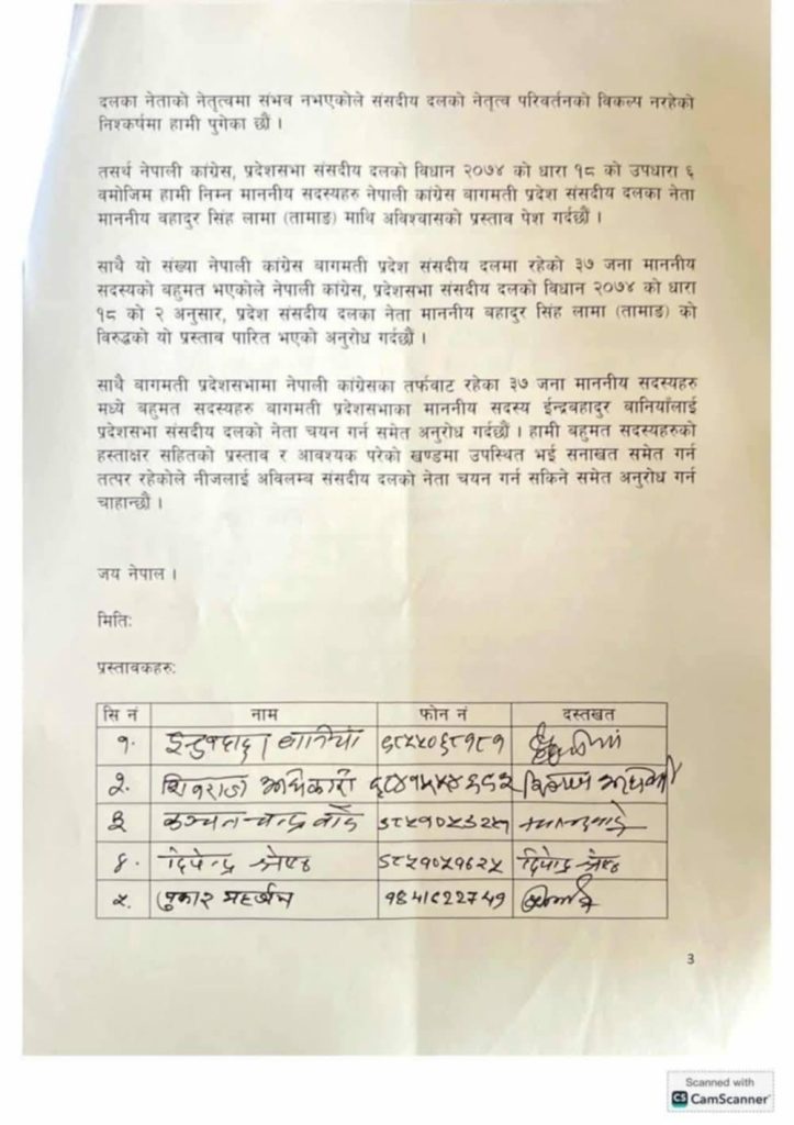 बागमती कांग्रेसमा विद्रोह: मुख्यमन्त्री लामाविरुद्ध २१ सांसदद्वारा अविश्वासको प्रस्ताव दर्ता सूचीसहित