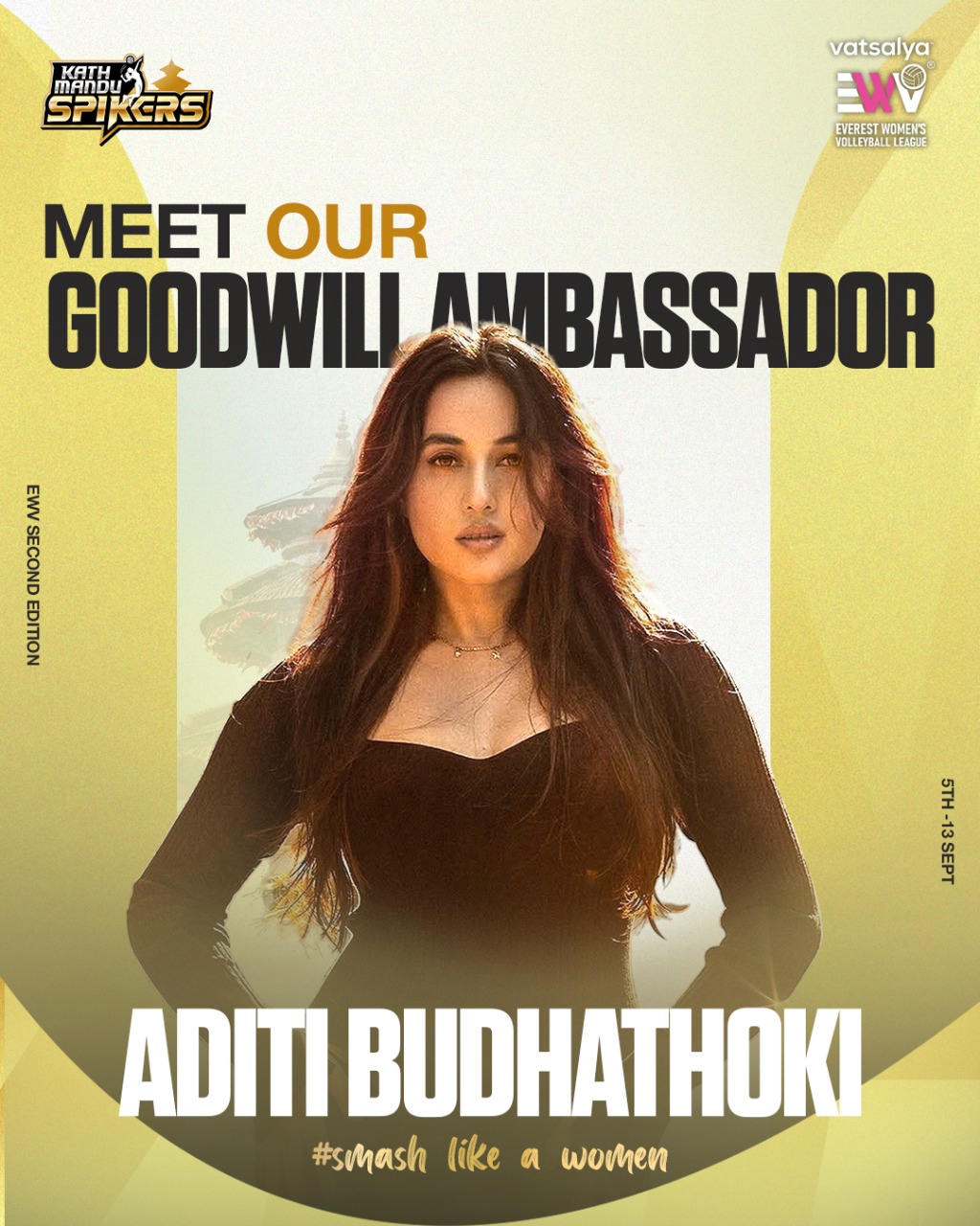 काठमाडौं साउन २९ गते । वात्सल्य एभरेष्ट महिला भलिबल लिग (इडब्लुभीएल) को फ्रेन्चाइज टोली काठमाडौं स्पाइकर्सले मुम्बई बेस्ड चर्चित नेपाली मोडल, नायिका तथा इन्फ्लुएन्सर अदिती बुढाथोकीलाई गुडविल एम्बासडर नियुक्त गरेको छ ।