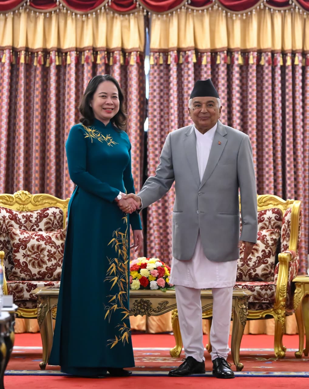 काठमाडौँ, ९ भदौ । राष्ट्रपति रामचन्द्र पौडेल र नेपाल भ्रमणमा रहनुभएकी भियतनामकी उपराष्ट्रपति वो थि आन्ह सुआनबीच आज शीतल निवासमा शिष्टाचार भेटवार्ता भएको छ।