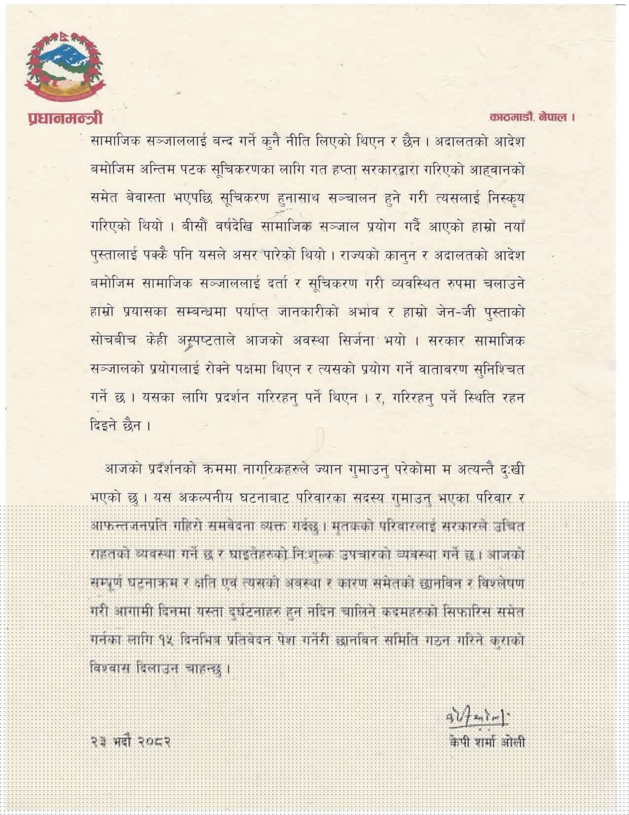 काठमाडौं, २३ भदाै । प्रधानमन्त्री केपी शर्मा ओलीले जेन-जी पुस्ताले आह्वान गरेको प्रदर्शनका क्रममा भएको घटनाप्रति दुःख व्यक्त गर्नुभएकाे छ ।