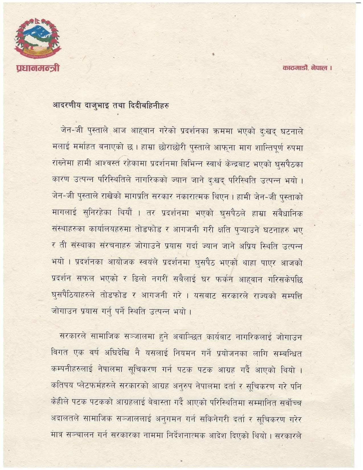 उहाँले भन्नुभयाे ‘हामी जेन–जी पुस्ताको मागलाई सुनिरहेका थियौं । तर प्रदर्शनमा ‘घुसपैठले हाम्रा संवैधानिक संस्थाहरुका कार्यालयहरुमा तोडफोड र आगजनी गरी क्षति पुर्याउने घटनाहरु भए र ती संस्थाका संरचनाहरु जोगाउने प्रयास गर्दा ज्यान जाने अप्रिय स्थिति उत्पन्न भयो ।’