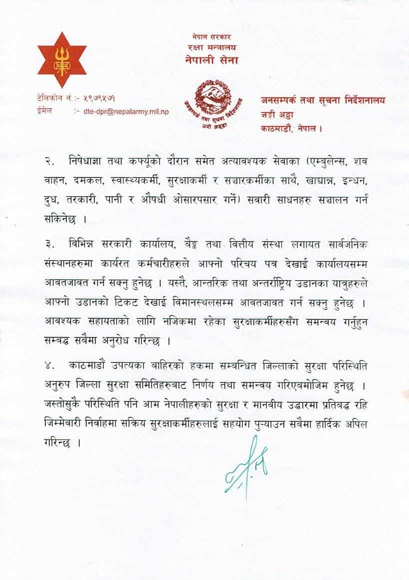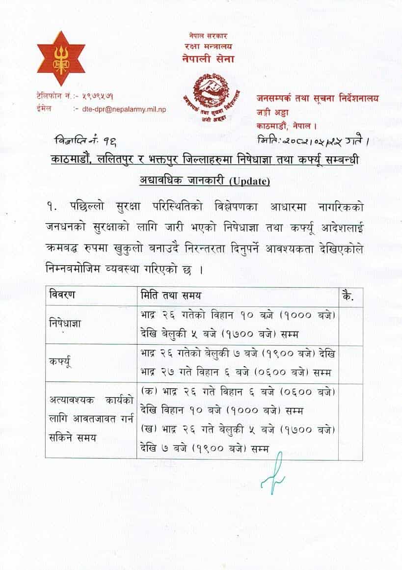 काठमाडौं, २६ भदाै । नेपाली सेनाले कर्फ्यु र निषेधाज्ञाको नयाँ समय तालिका सार्वजनिक गरेकाे छ ।