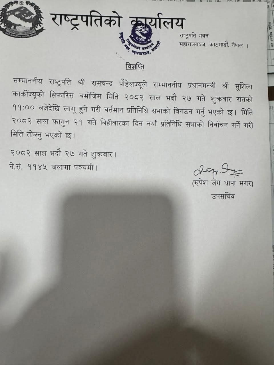 राष्ट्रपतिको कार्यालयद्वारा जारी विज्ञप्तिअनुसार कार्कीको सिफारिसमा आजै (भदौ २७ गते) राति ११ बजेदेखि लागू हुने गरी प्रतिनिधिसभा विघटन गर्नुभएकाे हाे ।