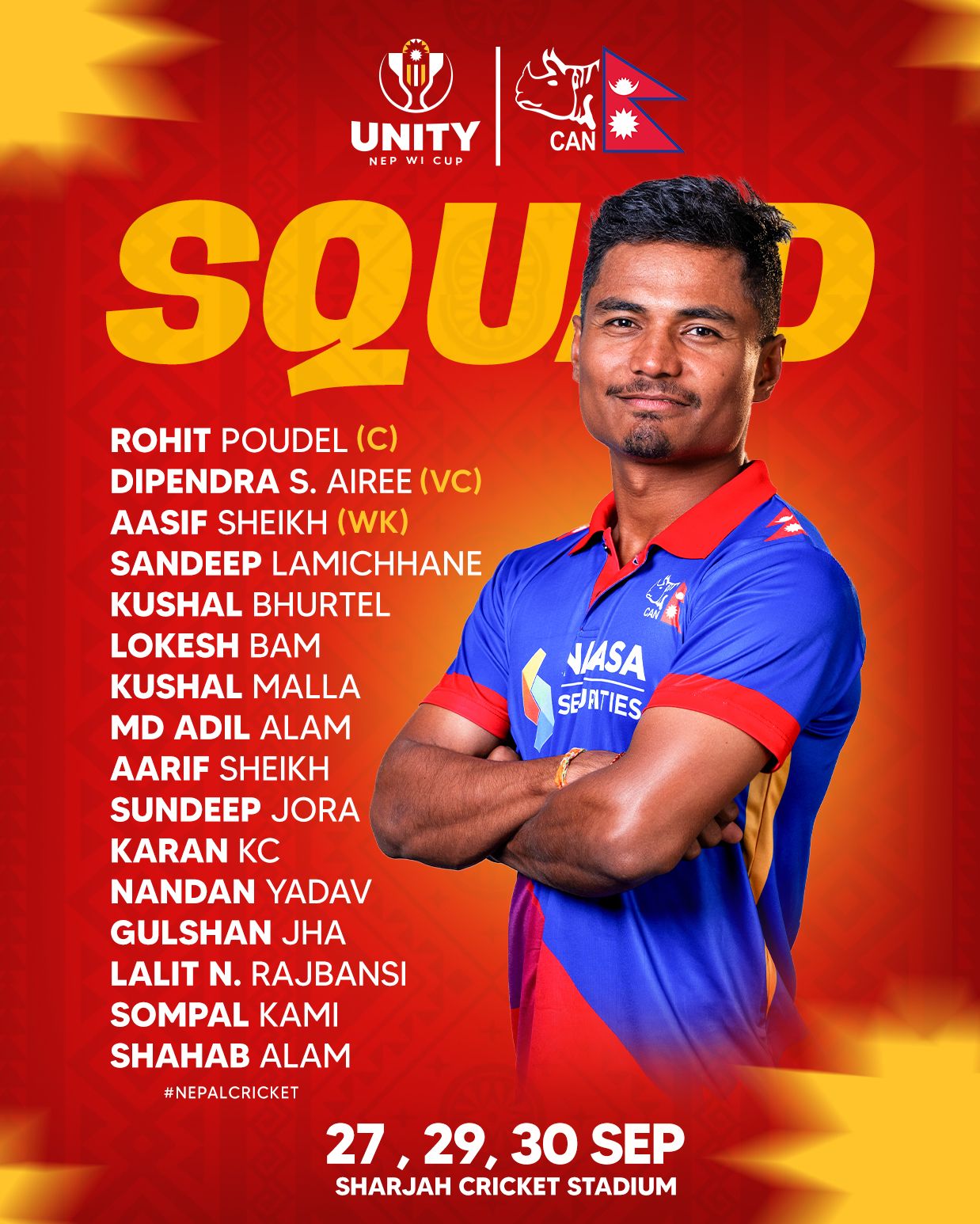 सो टोलीमा रोहितकुमार पौडेल कप्तान र दीपेन्द्र सिंह ऐरी उपकप्तान छन् ।