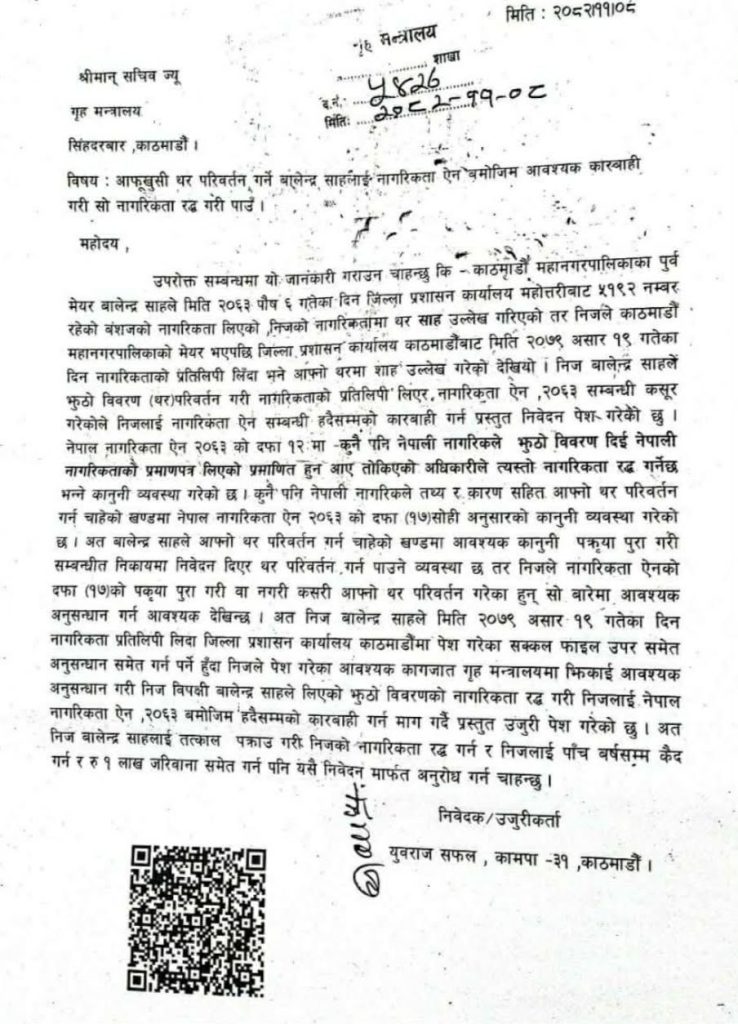 “साहले नागरिकताको विवरण कुन आधारमा र कसरी परिवर्तन गरे ? यस विषयमा सम्बन्धित फाइल र कागजातहरू झिकाई गहिरो अनुसन्धान हुन जरुरी छ,” उजुरीमा भनिएको छ ।