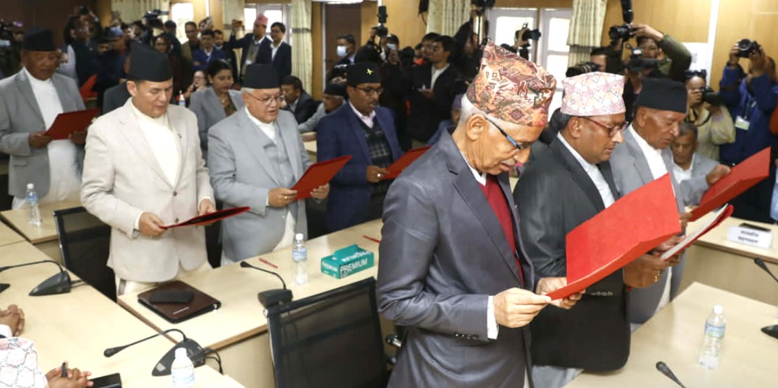आज शपथ ग्रहण गर्नेहरूमा खम्मबहादुर खाती, गीता देवकोटा, चन्द्रबहादुर केसी, जगत तिमल्सिना, धर्मेन्द्र पासवान, प्रेमप्रसाद दङ्गाल, महन्थ ठाकुर, रञ्जित कर्ण र रामकुमारी झाँक्री रहेका छन्।